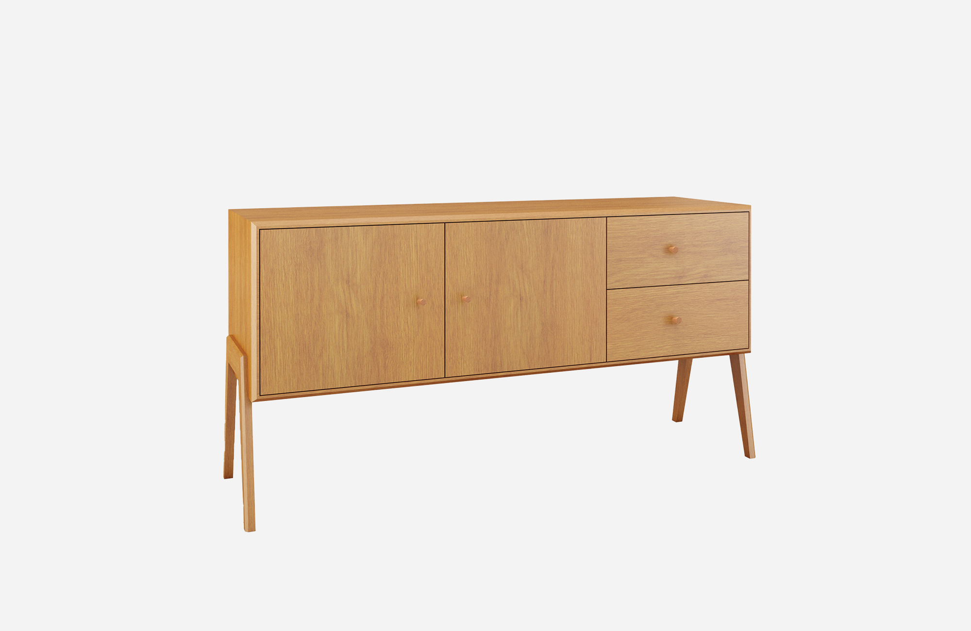 Wyposażony w dwoje drzwi kryjących pojemne wewnętrzne półki, oferuje dużo miejsca na naczynia, tekstylia domowe, dokumenty lub inne przedmioty, które chcesz przechowywać w uporządkowany sposób. Dodatkowo kredens posiada dwie szuflady z systemem samodomykowym, zapewniającym płynne, ciche i komfortowe domykanie - idealne do przechowywania drobnych akcesoriów i rzeczy, które potrzebujesz mieć zawsze pod ręką. Front mebla nadaje mu elegancki wygląd i ciepły, przyjemny w odbiorze charakter. Naturalny rysunek dębu sprawia, że kredens doskonale wpasowuje się zarówno w nowoczesne, jak i bardziej klasyczne aranżacje.