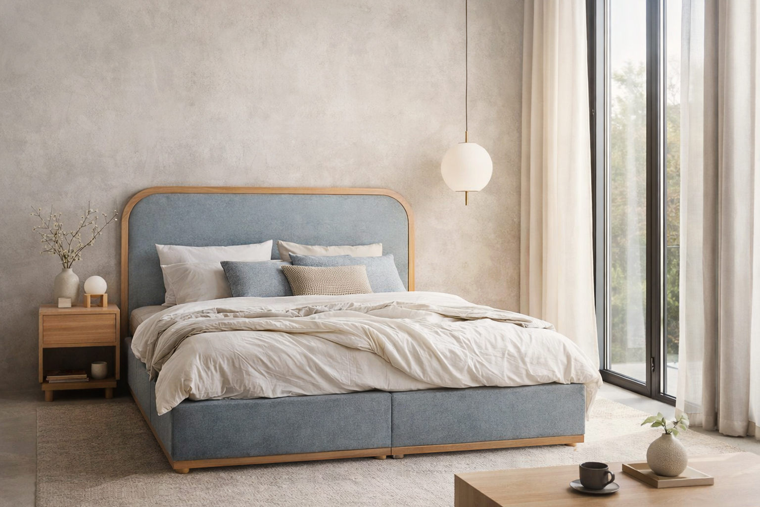 Bądź bliżej natury, dzięki nowoczesnemu łóżku Japandi w wersji z tapicerowanym zagłówkiem. Łóżko z kolekcji Japandi zostało zaprojektowane przez architektów Five Cell.