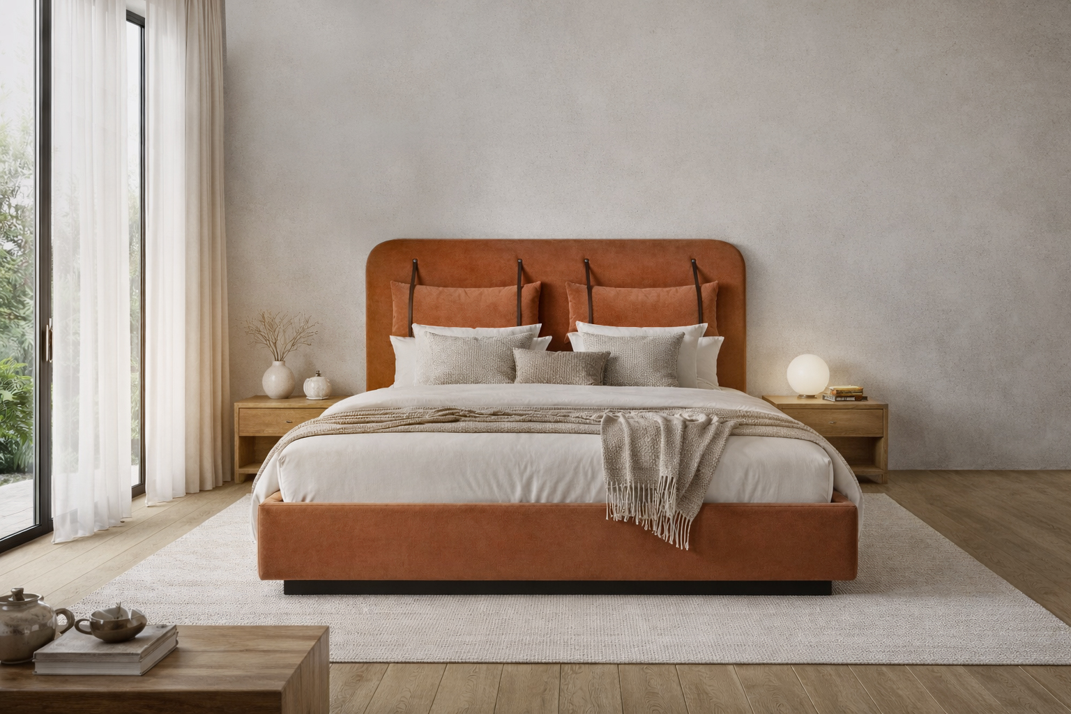 Sypialnia to bez wątpienia jedno z ważniejszych pomieszczeń w każdym domu i mieszkaniu, a kluczową rolę odgrywa w niej jeden mebel – łóżko. Wychodząc naprzeciw oczekiwaniom naszych klientów projektanci ze studia Five Cell stworzyli wyjątkowe łóżko sypialniane o ponadczasowym kształcie. Pełne klasy i elegancji łóżko Rejse idealnie odnajdzie się we wnętrzu każdej sypialni w stylu nowoczesnym, jak również w stylu retro, stanie się jej nieodłączną ozdobą, zapewniając wrażenie harmonii i przytulności. Łóżko Rejse o zaoblonym kształcie i zwartej formie, w pełni zabudowane, tapicerowana podstawa z ukrytymi nóżkami. Kluczowym elementem są duże, dekoracyjne poduszki zawieszone na skórzanych paskach z metalowymi pinami. Forma inspirowana jest wspomnieniem podróży. Przywołuje na myśl rzeczy piękne, powiązane z sentymentem i wędrówką. Każdy nosi w swoich wspomnieniach najpiękniejszą podróż życia. Solidna drewniana konstrukcja wykonane są z najwyższej klasy, certyfikowanego drewna bukowego, gwarantującego stabilność mebla, trwałość oraz bezpieczeństwo jego użytkowania. Uwaga! Łóżko do samodzielnego montażu; zawiera wezgłowie, stelaż wraz z drabinką, nóżki oraz wszystkie niezbędne elementy do montażu. Łóżko sprzedawane jest bez materaca. Na wezgłowiu brązowe paski skórzane i zaśniedziałe piny.