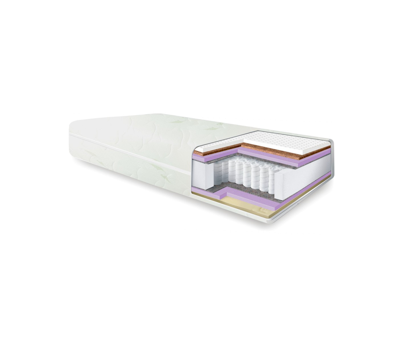 Siedmiostrefowy materac kieszeniowy Havre z rdzeniem wykonanym ze sprężyn multipocketowych, pianki Flexi, pianki termoplastycznej, pianki lateksowej i warstwy kokosu.